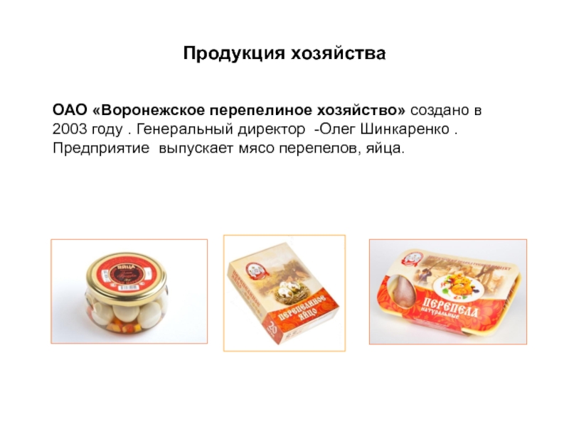 ОАО «Воронежское перепелиное хозяйство» создано в 2003 году . Генеральный директор