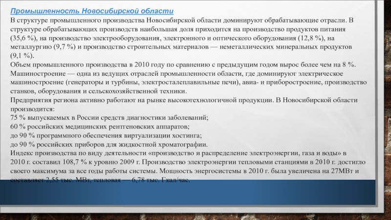 В структуре промышленного производства Новосибирской области доминируют обрабатывающие отрасли.