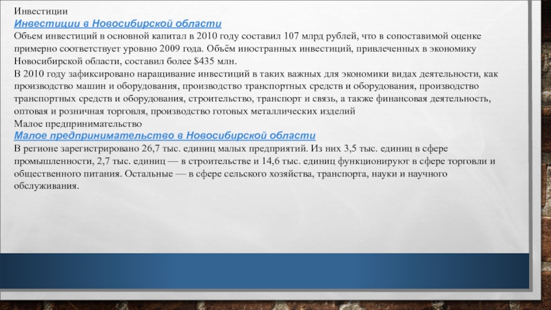 107 млрд рублей, что в сопоставимой оценке примерно соответствует уровню 2009 года. Объём иностранных инвестиций, привлеченных в экономику Новосибирской области, составил более $435 млн.