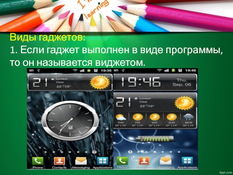 Виды гаджетов: 1. Если гаджет выполнен в виде программы, то он называется виджетом.