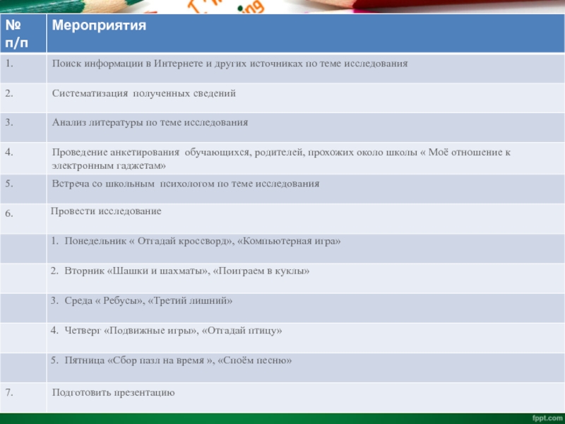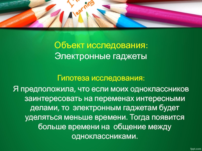 Объект исследования: Электронные гаджетыГипотеза исследования:Я предположила, что если моих одноклассников заинтересовать на переменах интересными делами, то электронным