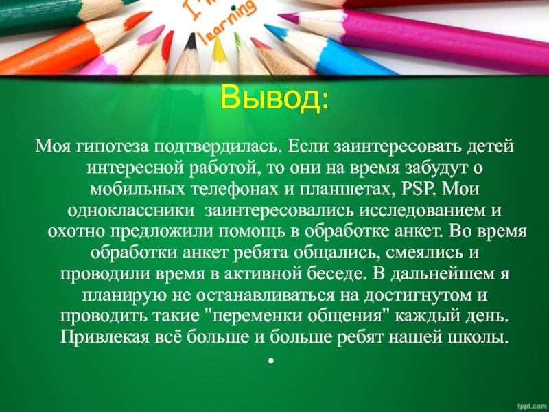Вывод:Моя гипотеза подтвердилась. Если заинтересовать детей интересной работой, то они на время забудут о мобильных телефонах и