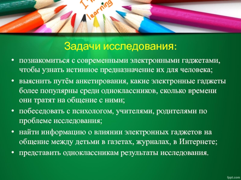 Задачи исследования:познакомиться с современными электронными гаджетами, чтобы узнать истинное предназначение их для человека;выяснить путём анкетирования, какие электронные