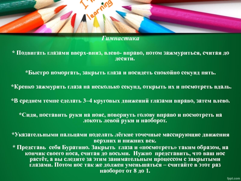 Гимнастика * Подвигать глазами вверх-вниз, влево- вправо, потом зажмуриться, считая до десяти.*Быстро поморгать, закрыть глаза и посидеть спокойно