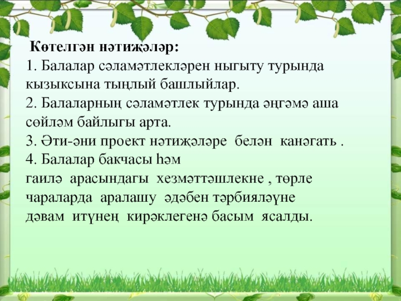 Көтелгән нәтиҗәләр:1. Балалар сәламәтлекләрен ныгыту турында кызыксына тыңлый башлыйлар.2. Балаларның сәламәтлек турында әңгәмә аша сөйләм байлыгы