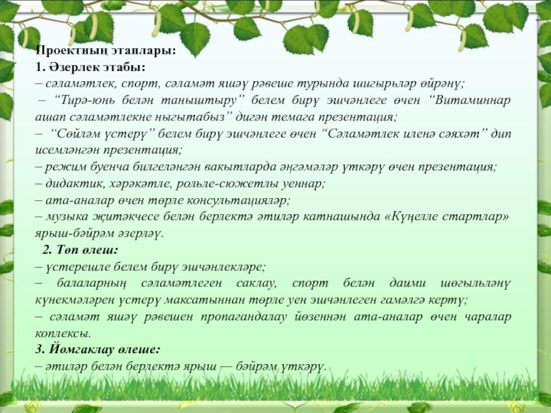 Проектның этаплары:1. Әзерлек этабы:– сәламәтлек, спорт, сәламәт яшәү рәвеше турында шигырьләр өйрәнү; – “Тирә-юнь белән таныштыру” белем бирү