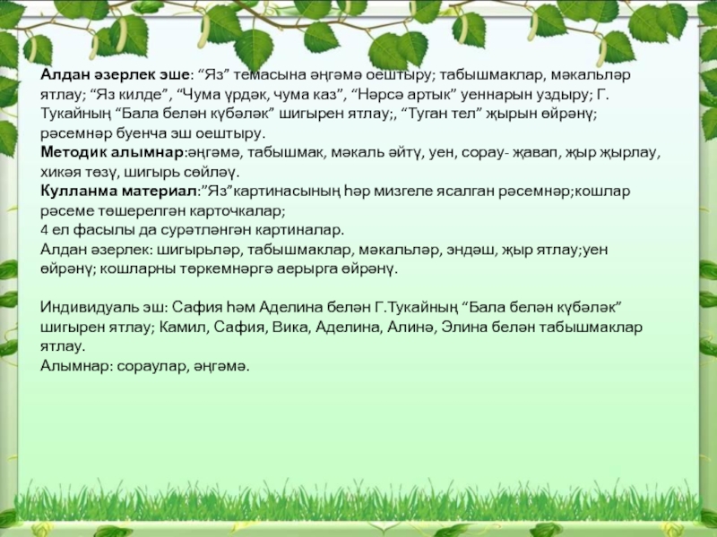 Алдан әзерлек эше: “Яз” темасына әңгәмә оештыру; табышмаклар, мәкальләр ятлау; “Яз килде”, “Чума үрдәк, чума каз”, “Нәрсә артык”