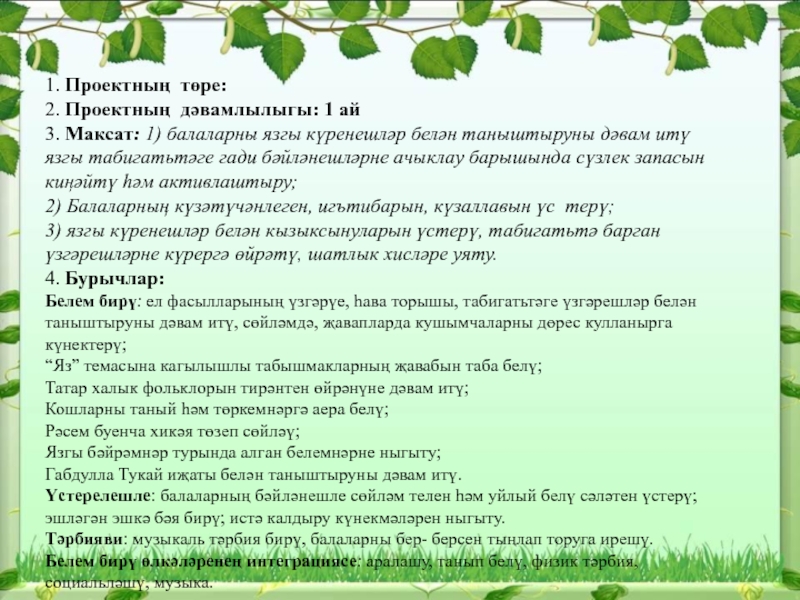 1. Проектның  төре:2. Проектның  дәвамлылыгы: 1 ай3. Максат: 1) балаларны язгы күренешләр белән таныштыруны дәвам итү язгы табигатьтәге гади бәйләнешләрне ачыклау барышында сүзлек запасын киңәйтү һәм активлаштыру;2) Балаларның күзәтүчәнлеген, игътибарын, күзаллавын үс терү; 3) язгы күренешләр
