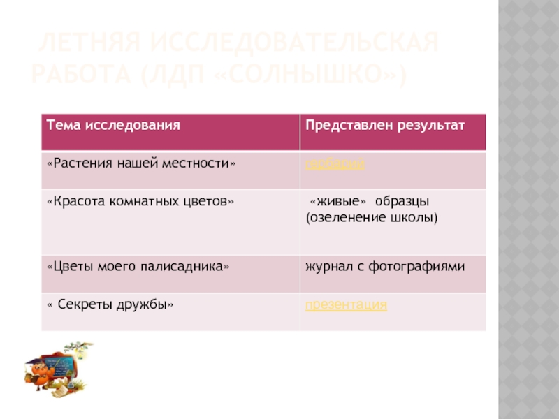 Слайд 16 ЛЕТНЯЯ ИССЛЕДОВАТЕЛЬСКАЯ РАБОТА (ЛДП «СОЛНЫШКО»)
