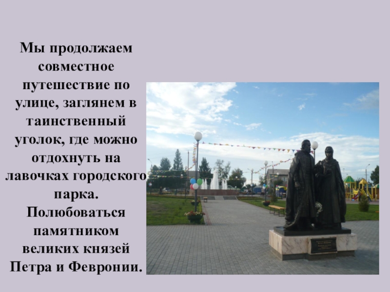 можно отдохнуть на лавочках городского парка. Полюбоваться памятником великих князей Петра и Февронии.