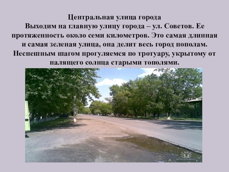 Центральная улица города  Выходим на главную улицу города – ул. Советов. Ее протяженность около семи километров.