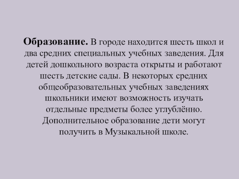 специальных учебных заведения. Для детей дошкольного возраста открыты и работают шесть детские сады. В некоторых средних общеобразовательных учебных заведениях школьники имеют возможность изучать отдельные предметы более углублённо. Дополнительное образование дети могут получить в Музыкальной школе.