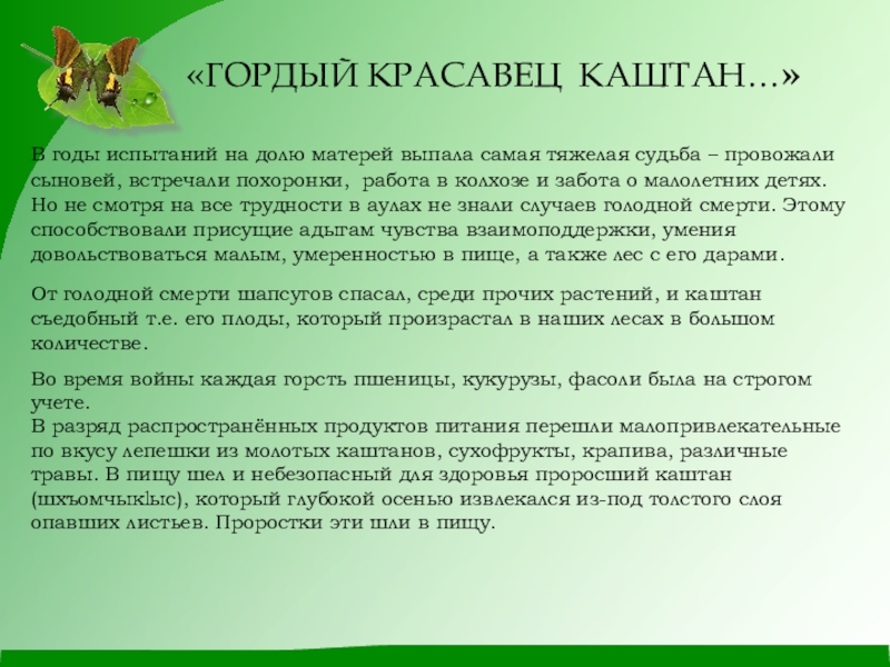 помнить какую роль сыграл каштан в трудной жизненной ситуации адыгского народа во время ВОВ.