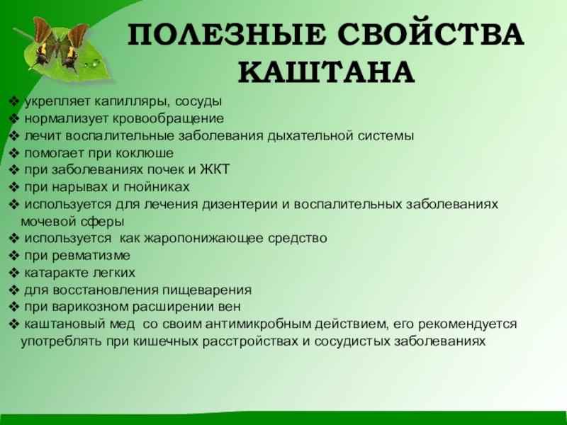Слайд 7ПОЛЕЗНЫЕ СВОЙСТВА КАШТАНА
