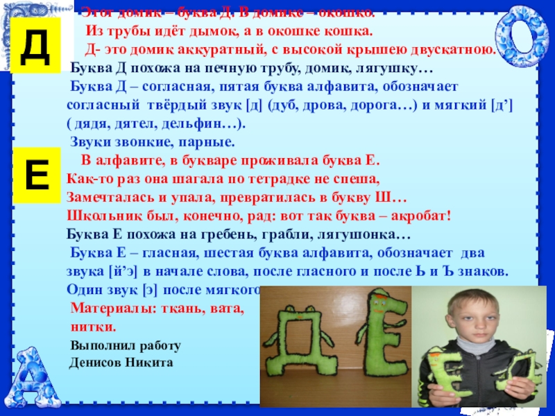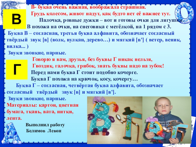 Буква Б – согласная, вторая буква алфавита, обозначает согласный твёрдый звук [б] ( баран, буква, бутон…)и мягкий [б’] ( белка, бинокль, бисер... )