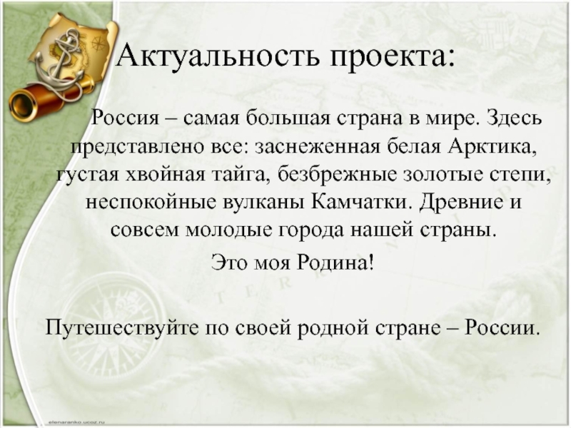 Актуальность проекта:    Россия – самая большая страна в мире. Здесь представлено все: заснеженная белая