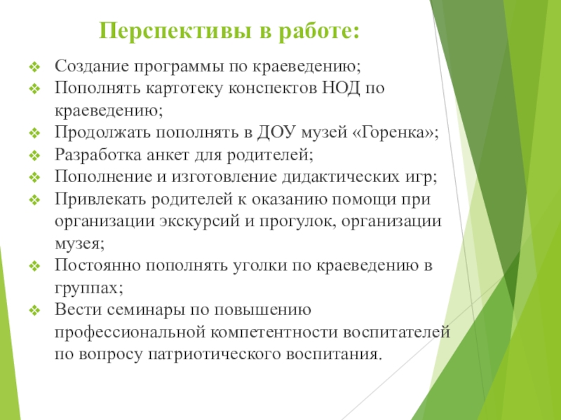 Постоянно пополнять уголки по краеведению в группах;