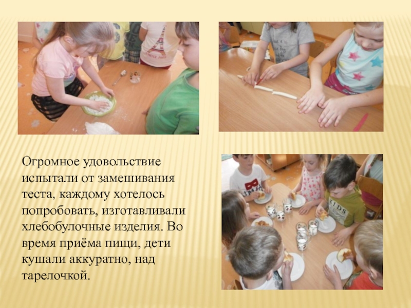 Слайд 17Огромное удовольствие испытали от замешивания теста, каждому хотелось попробовать, изготавливали хлебобулочные