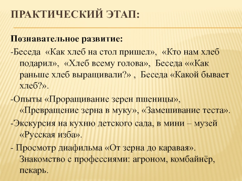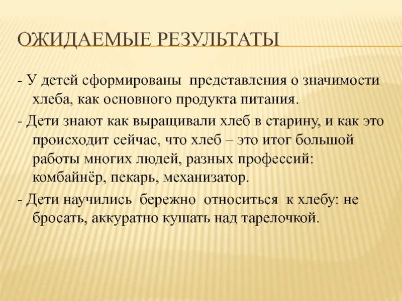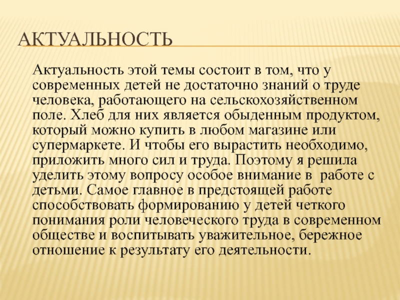 достаточно знаний о труде человека, работающего на сельскохозяйственном поле. Хлеб для них является обыденным продуктом, который можно купить в любом магазине или супермаркете. И чтобы его вырастить необходимо, приложить много сил и труда. Поэтому я решила уделить этому вопросу особое внимание в работе с детьми. Самое главное в предстоящей работе способствовать формированию у детей четкого понимания роли человеческого труда в современном обществе и воспитывать уважительное, бережное отношение к результату его деятельности.