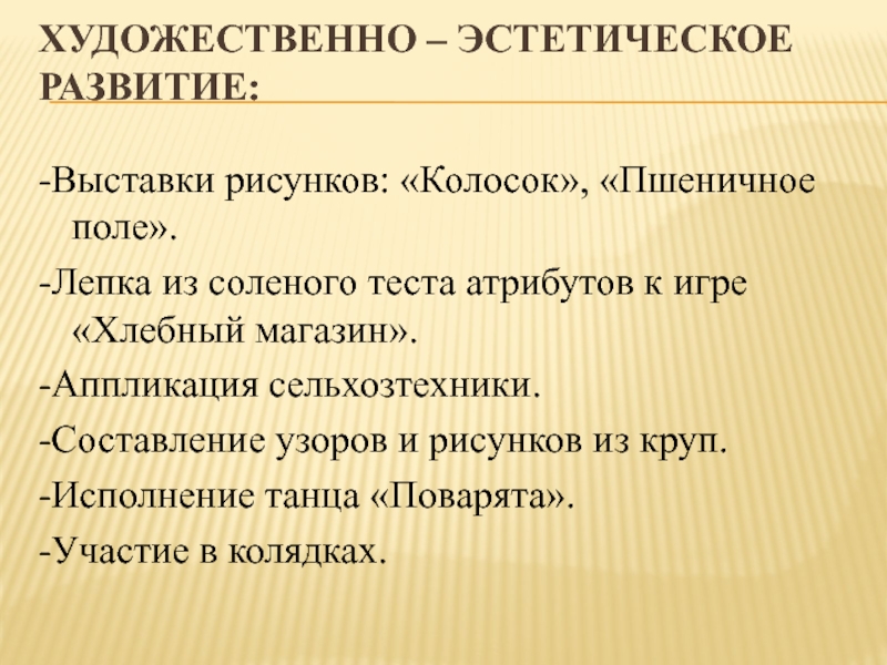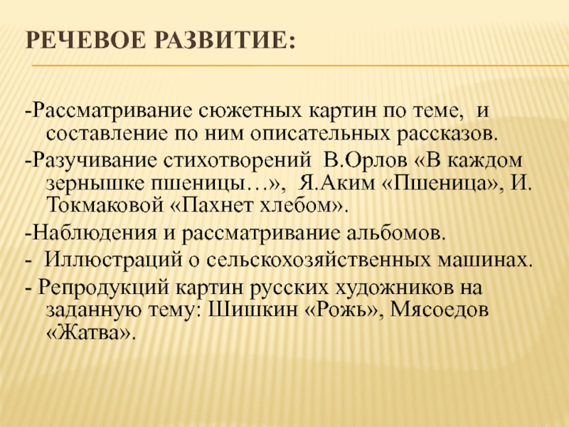 -Разучивание стихотворений В.Орлов «В каждом зернышке пшеницы…», Я.Аким «Пшеница», И.Токмаковой «Пахнет хлебом».