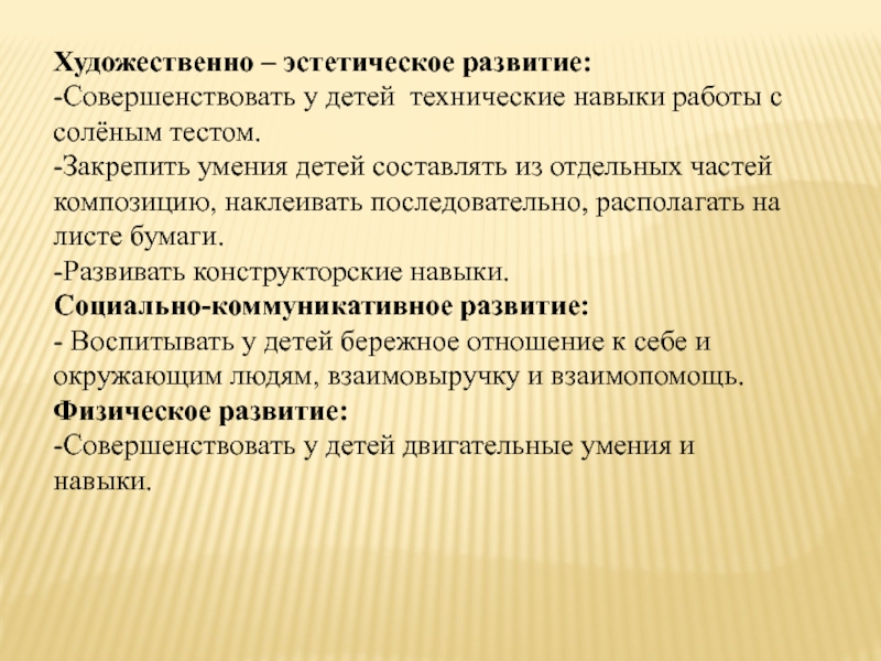 -Способствовать созданию эмоционально — комфортной среды для самостоятельного проявления творческой активности и обогащения личного опыта каждого ребёнка.