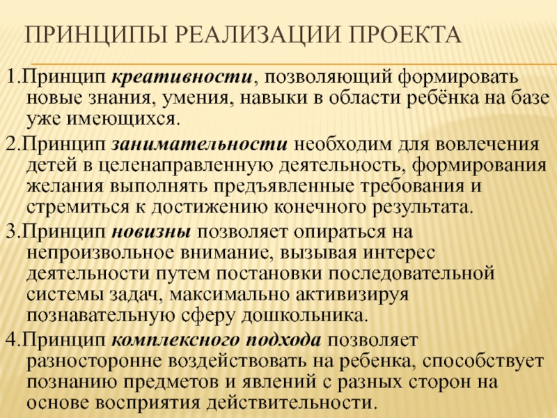 4.Принцип комплексного подхода позволяет разносторонне воздействовать на ребенка, способствует познанию предметов и явлений с разных сторон на основе восприятия действительности.