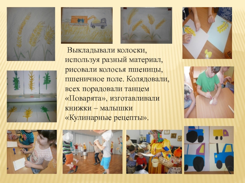 Выкладывали колоски, используя разный материал, рисовали колосья пшеницы, пшеничное поле.