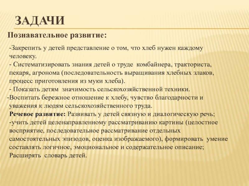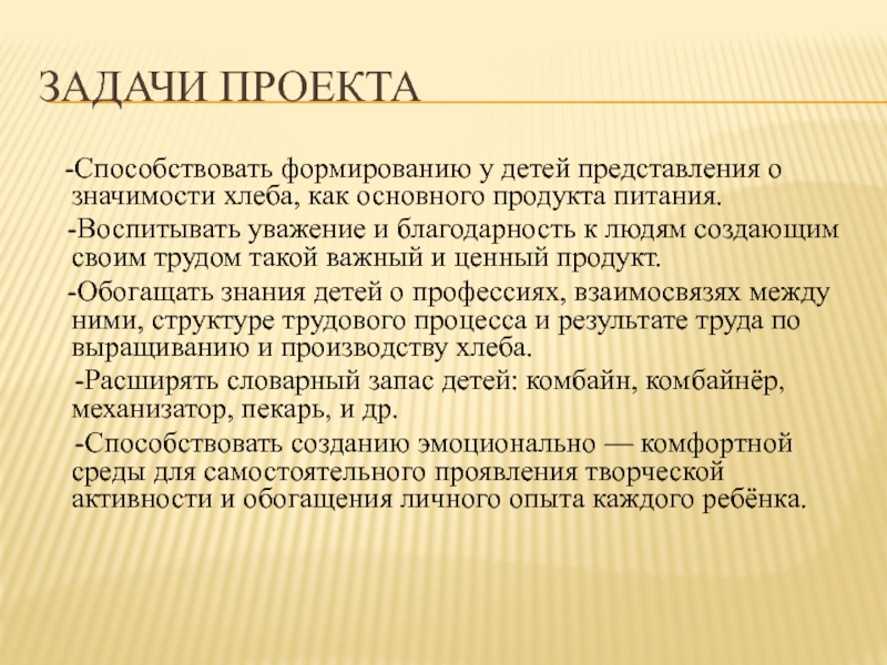-Обогащать знания детей о профессиях, взаимосвязях между ними, структуре трудового процесса и результате труда по выращиванию и производству хлеба.
