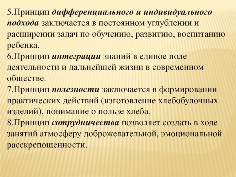7.Принцип полезности заключается в формировании практических действий (изготовление хлебобулочных изделий), понимание о пользе хлеба.