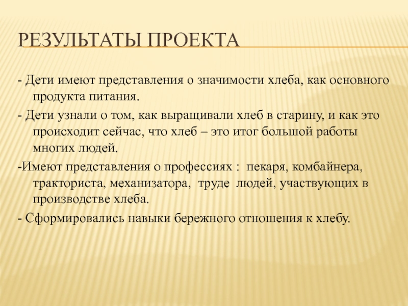 - Дети знают как выращивали хлеб в старину, и как это происходит сейчас, что хлеб – это итог большой работы многих людей, разных профессий: комбайнёр, пекарь, механизатор.