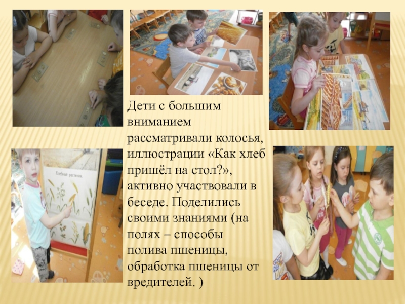 Слайд 19Дети с большим вниманием рассматривали колосья, иллюстрации «Как хлеб пришёл на
