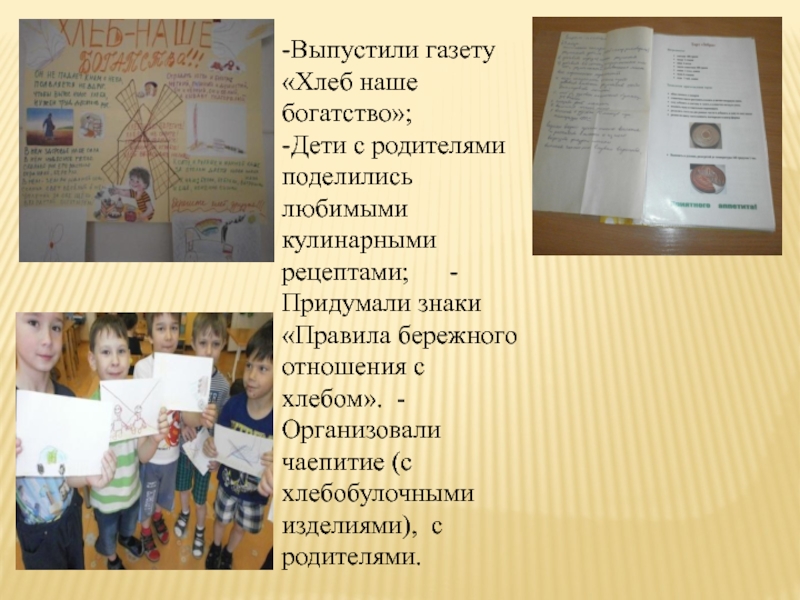 -Придумали знаки «Правила бережного отношения с хлебом». -Организовали чаепитие (с хлебобулочными изделиями), с родителями.