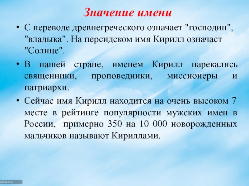 1.Изучить значение и происхождение имени Кирилл.