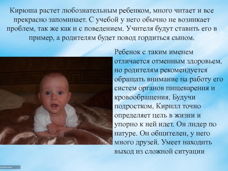 Ребенок с таким именем отличается отменным здоровьем, но родителям рекомендуется обращать внимание на работу его систем органов пищеварения и кровообращения. Будучи подростком, Кирилл точно определяет цель в жизни и упорно к ней идет. Он лидер по натуре. Он общителен, у него много друзей. Умеет находить выход из сложной ситуации