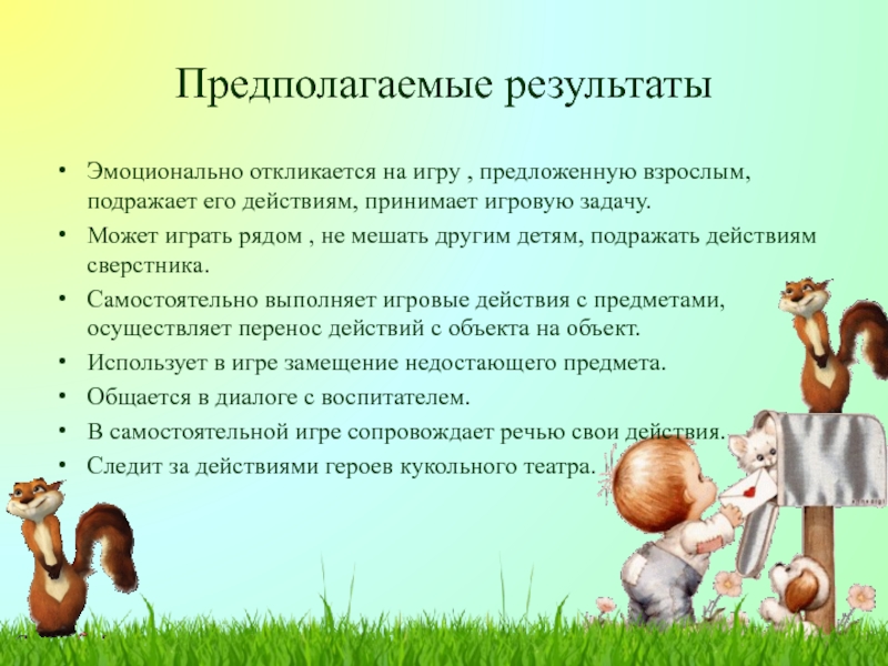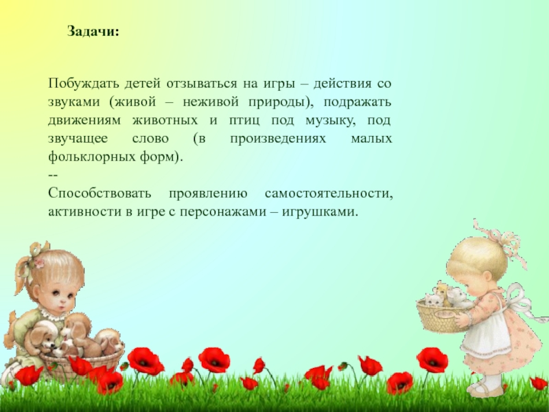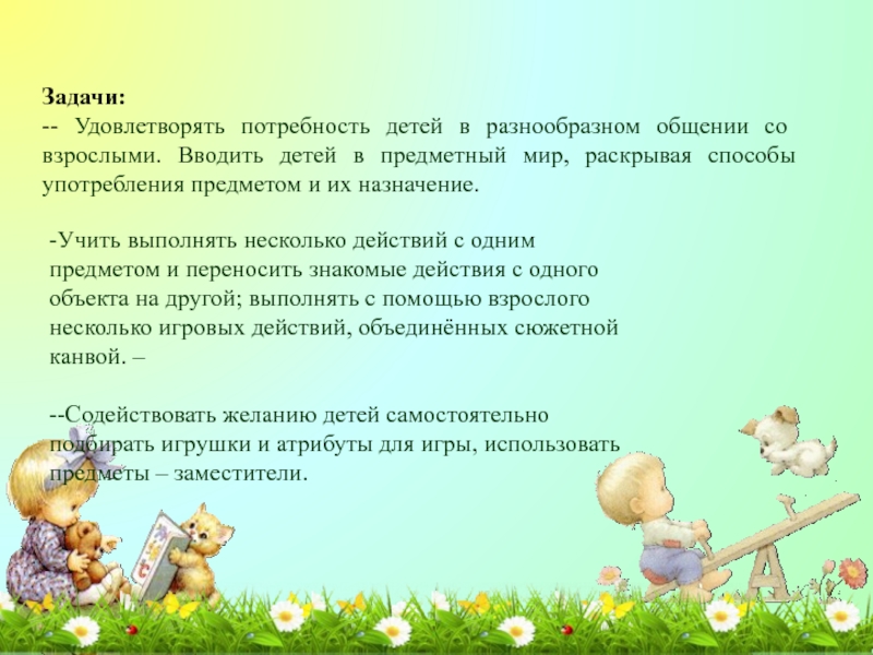 -Учить выполнять несколько действий с одним предметом и переносить знакомые действия с одного объекта на другой; выполнять с помощью взрослого несколько игровых действий, объединённых сюжетной канвой. –