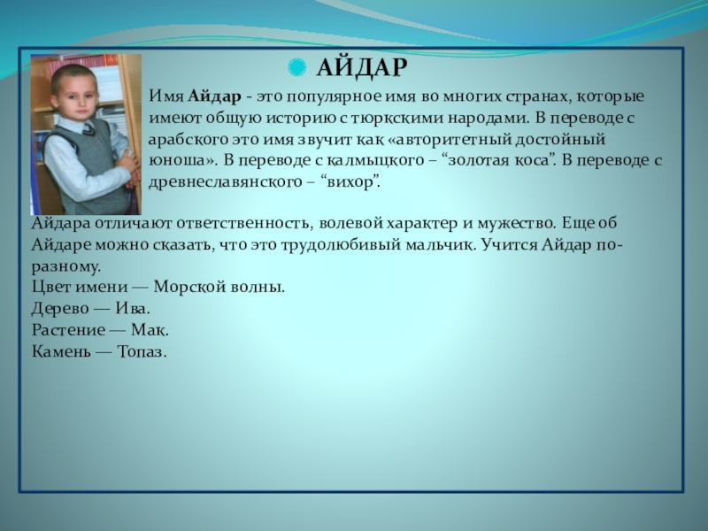 Айдара отличают ответственность, волевой характер и мужество. Еще об Айдаре можно сказать, что это трудолюбивый мальчик. Учится Айдар по-разному.