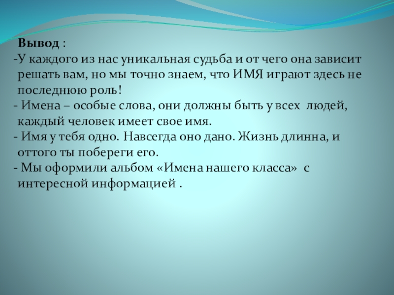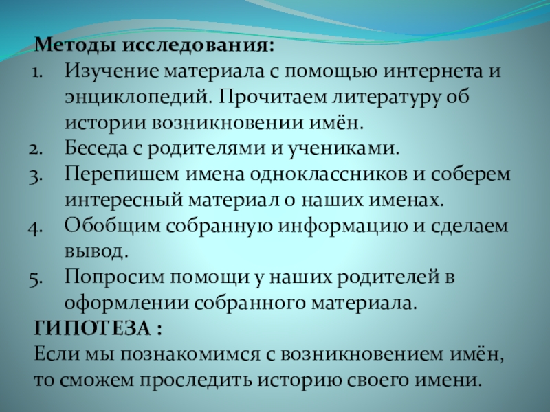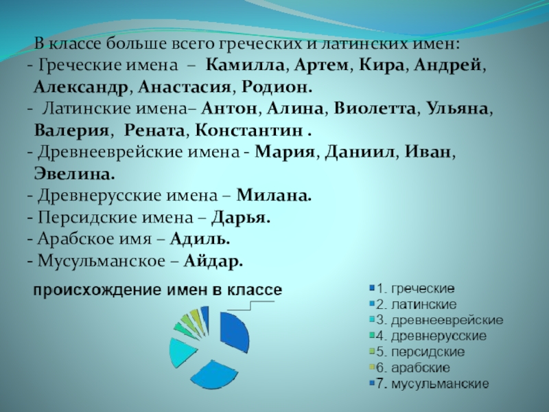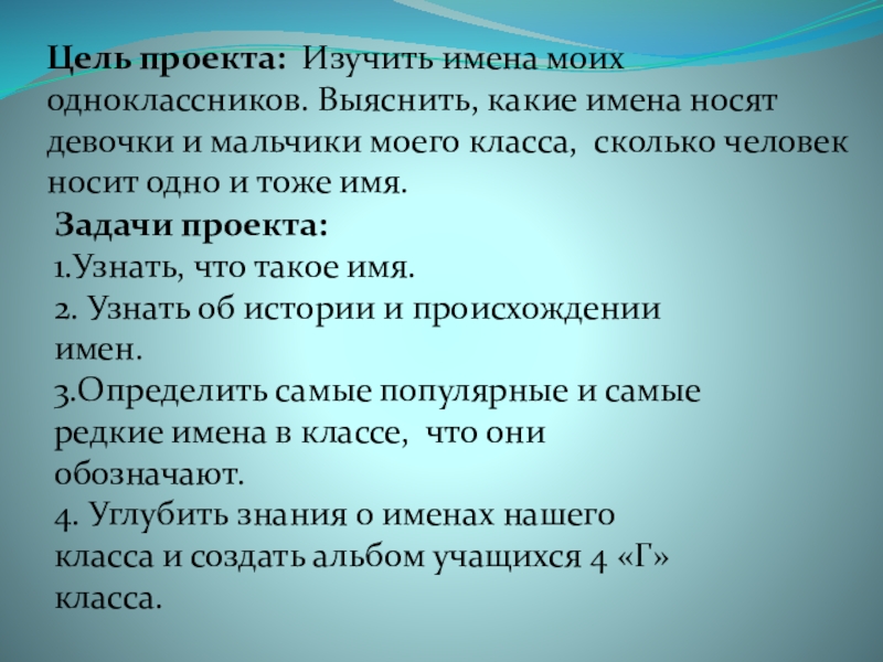 Цель проекта: Изучить имена моих одноклассников. Выяснить, какие имена носят девочки и мальчики моего класса, сколько человек носит одно и тоже имя.