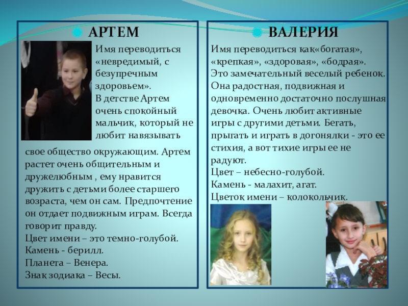 свое общество окружающим. Артем растет очень общительным и дружелюбным , ему нравится дружить с детьми более старшего возраста, чем он сам. Предпочтение он отдает подвижным играм. Всегда говорит правду.