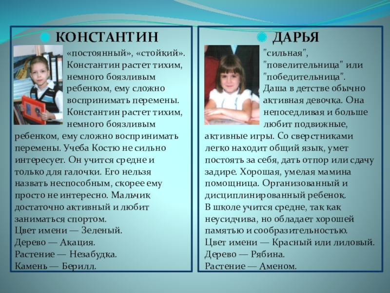 ребенком, ему сложно воспринимать перемены. Учеба Костю не сильно интересует. Он учится средне и только для галочки. Его нельзя назвать неспособным, скорее ему просто не интересно. Мальчик достаточно активный и любит заниматься спортом.