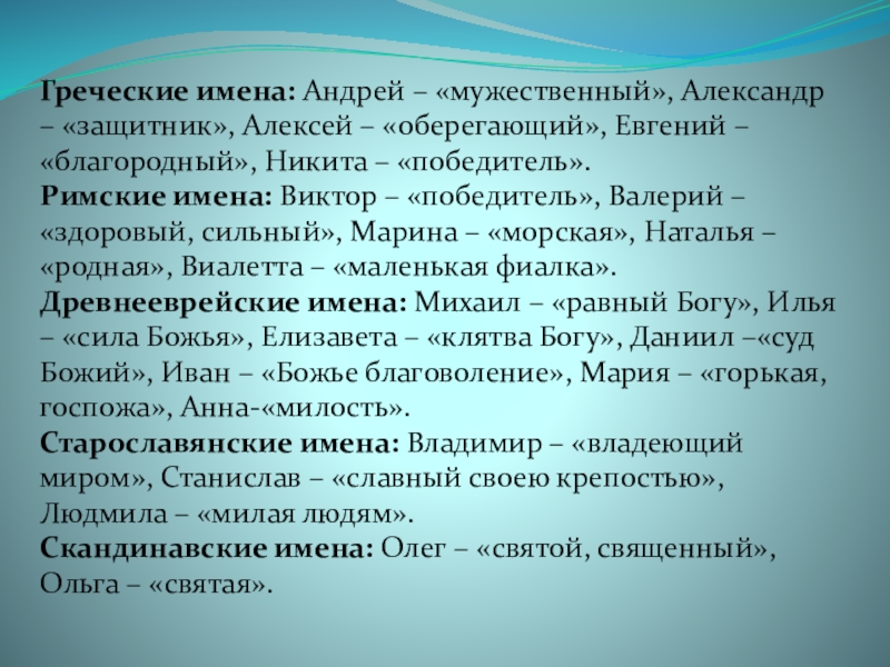 Это в большинстве своём имена греческого происхождения. Появились латинские, древнееврейские, древнеперсидские и другие.