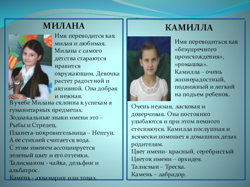 Имя переводиться как «безупречного происхождения», «ромашка». Камилла – очень жизнерадостный, подвижный и легкий на подъем ребенок.