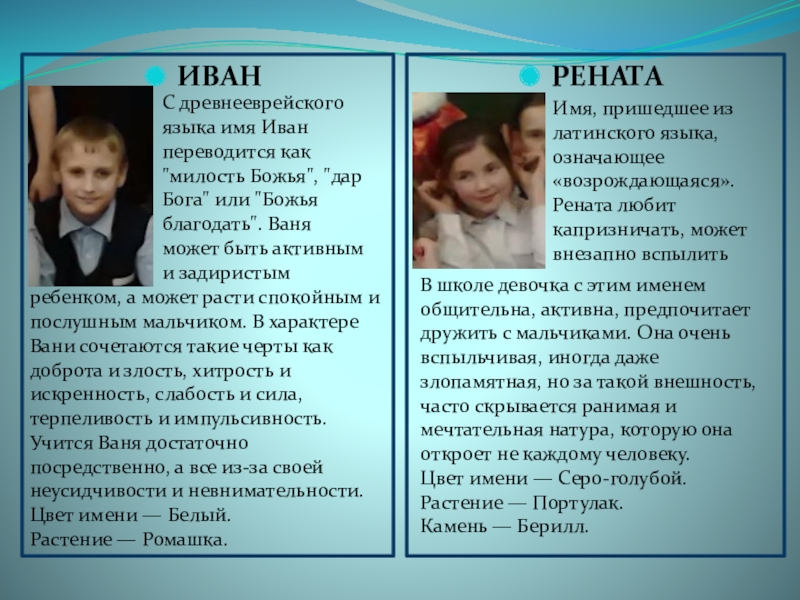 ребенком, а может расти спокойным и послушным мальчиком. В характере Вани сочетаются такие черты как доброта и злость, хитрость и искренность, слабость и сила, терпеливость и импульсивность. Учится Ваня достаточно посредственно, а все из-за своей неусидчивости и невнимательности.
