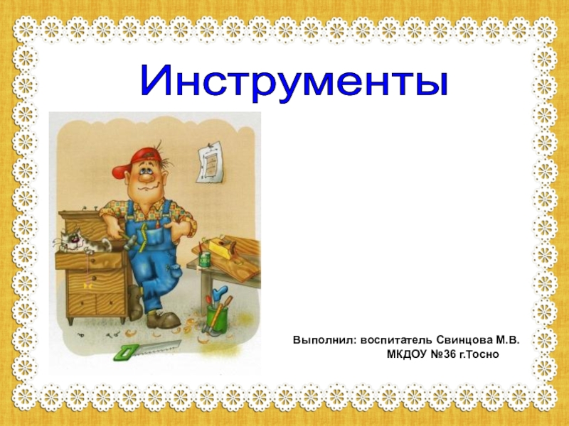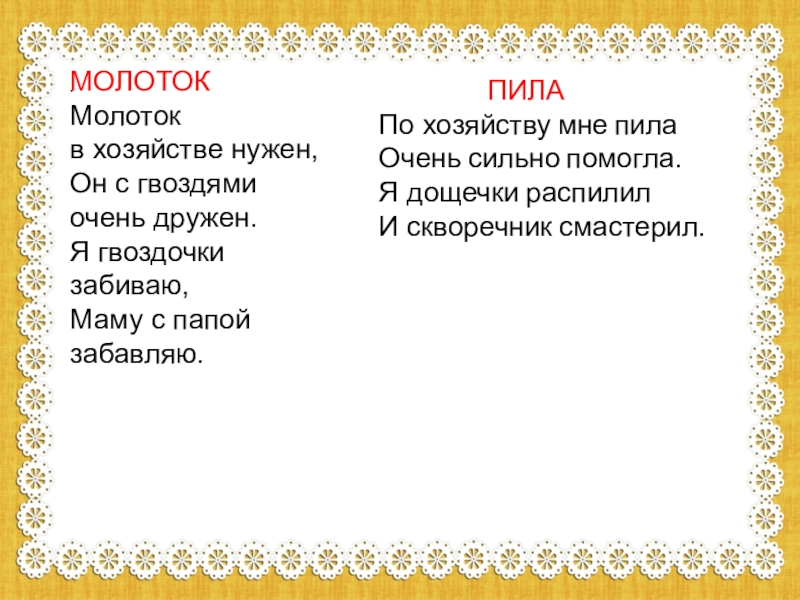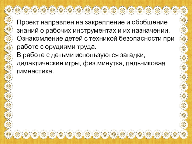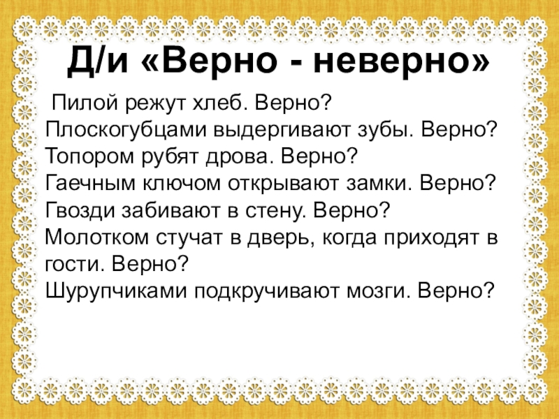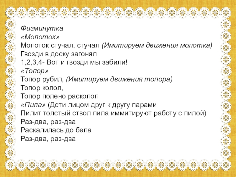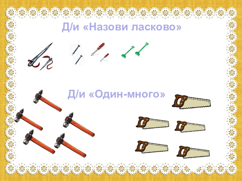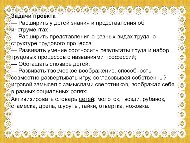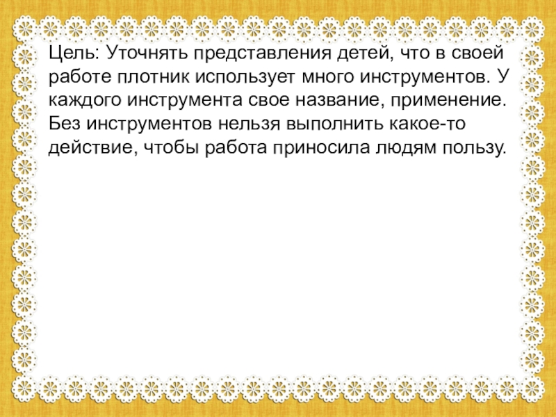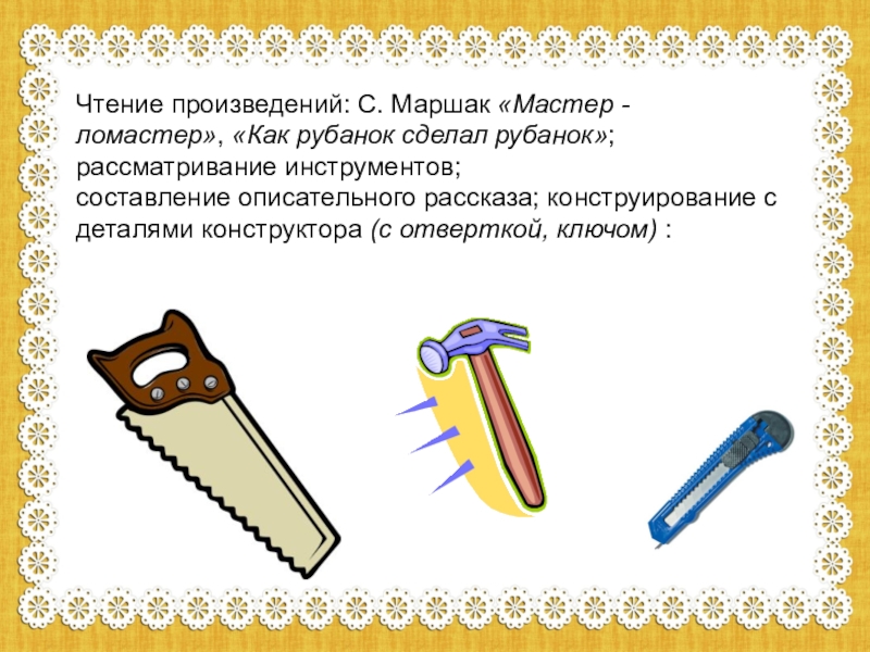 Активизировать словарь детей: молоток, гвозди, рубанок, стамеска, дрель, шурупы, гайки, отвертка, ножовка.