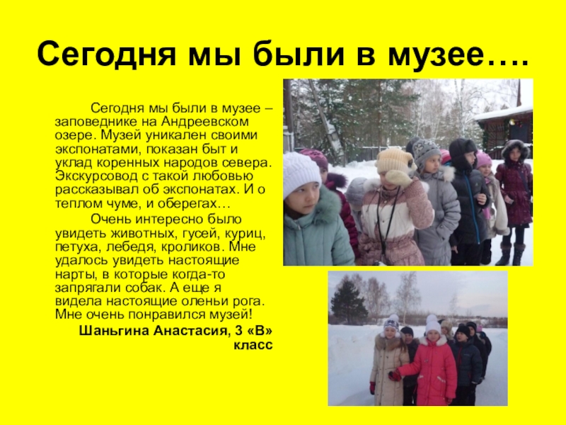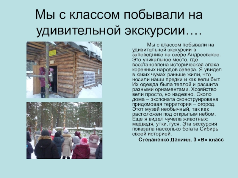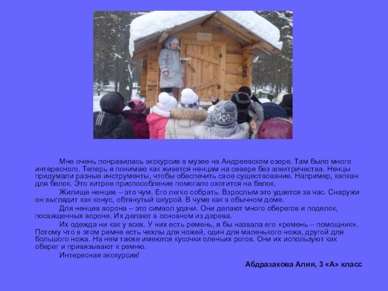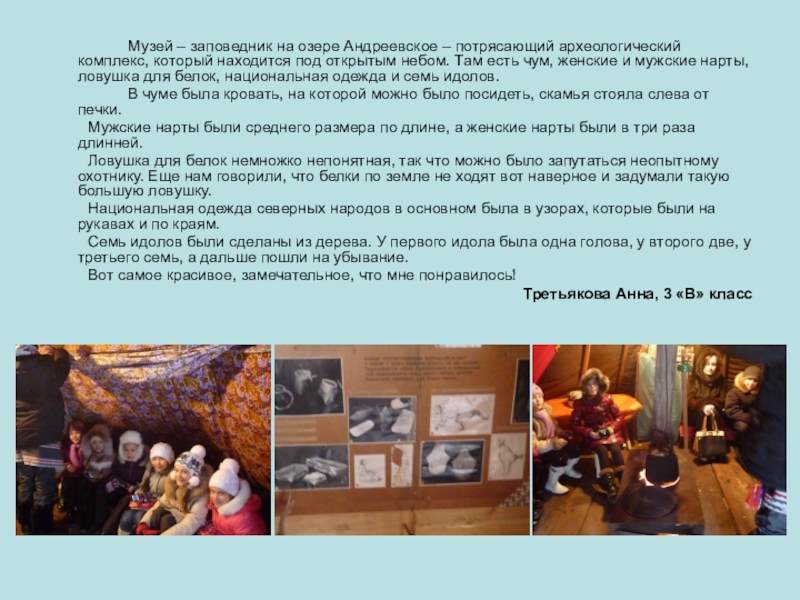 удивительной экскурсии в заповеднике на озере Андреевское. Это уникальное место, где восстановлена историческая эпоха коренных народов севера. Я увидел в каких чумах раньше жили, что носили наши предки и как вели быт. Их одежда была теплой и расшита разными орнаментами. Хозяйство вели просто, но надежно. Около дома – экспоната сконструирована придомовая территория – огород. Этот музей необычный, так как расположен под открытым небом. Еще я видел чучела животных: медведя, утки, гуся. Эта экскурсия показала насколько богата Сибирь своей историей.