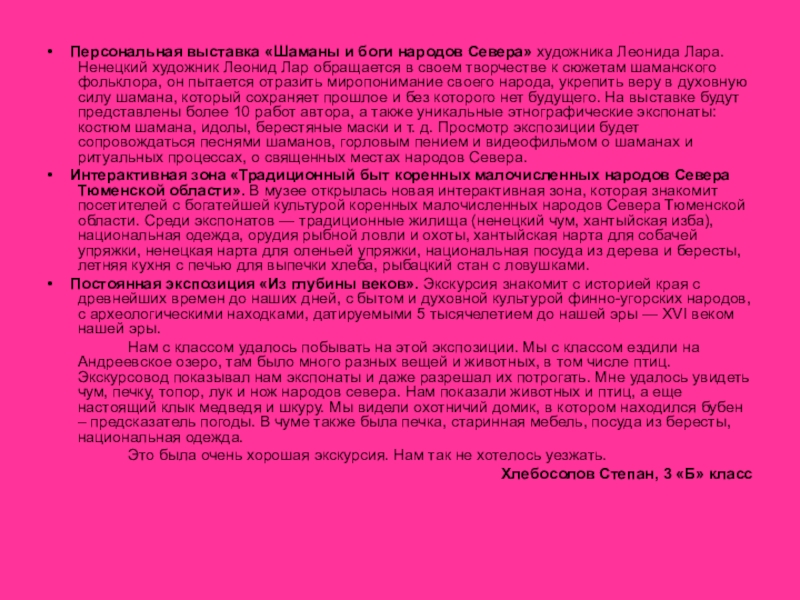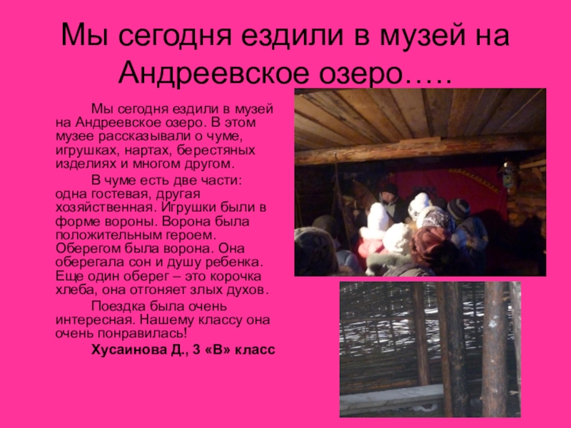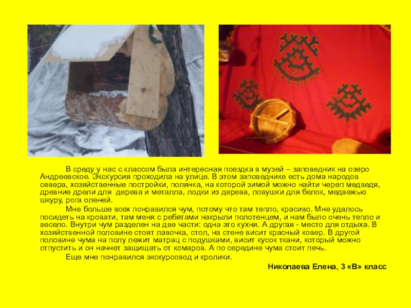 Нам с классом удалось побывать на этой экспозиции. Мы с классом ездили на Андреевское озеро, там было много разных вещей и животных, в том числе птиц. Экскурсовод показывал нам экспонаты и даже разрешал их потрогать. Мне удалось увидеть чум, печку, топор, лук и нож народов севера. Нам показали животных и птиц, а еще настоящий клык медведя и шкуру. Мы видели охотничий домик, в котором находился бубен – предсказатель погоды. В чуме также была печка, старинная мебель, посуда из бересты, национальная одежда.