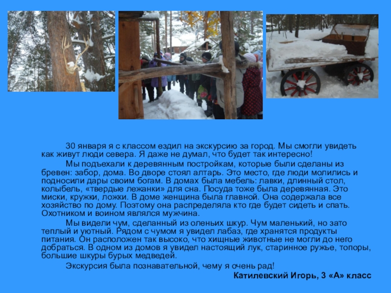 кроликов, уток, гусей, лебедя. Видел чум из оленей шкуры и из водопроницаемого полотна. Внутри чума находилась печь, чугунный котел, люлька для маленького ребенка. Видел охотничий дом, дом для хранения пищи, лук, стрелы и многое другое… Так же мне запомнилась водонепроницаемая корзина, байдарка, сеть и гарпун. А самым интересным, то, что мне ни разу не приходилось видеть это место жертвоприношения. В ходе экскурсии я узнал о жизни северных народов Тюменской области.