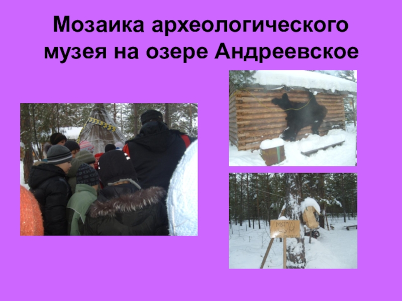 – заповедник на озеро Андреевское. Экскурсия проходила на улице. В этом заповеднике есть дома народов севера, хозяйственные постройки, полянка, на которой зимой можно найти череп медведя, древние дрели для дерева и металла, лодки из дерева, ловушки для белок, медвежью шкуру, рога оленей.