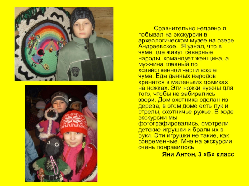 Андреевское. Я узнал, что в чуме, где живут северные народы, командует женщина, а мужчина главный по хозяйственной части возле чума. Еда данных народов хранится в маленьких домиках на ножках. Эти ножки нужны для того, чтобы не забирались звери. Дом охотника сделан из дерева, в этом доме есть лук и стрелы, охотничье ружье. В ходе экскурсии мы фотографировались, смотрели детские игрушки и брали их в руки. Эти игрушки не такие, как современные. Мне на экскурсии очень понравилось.