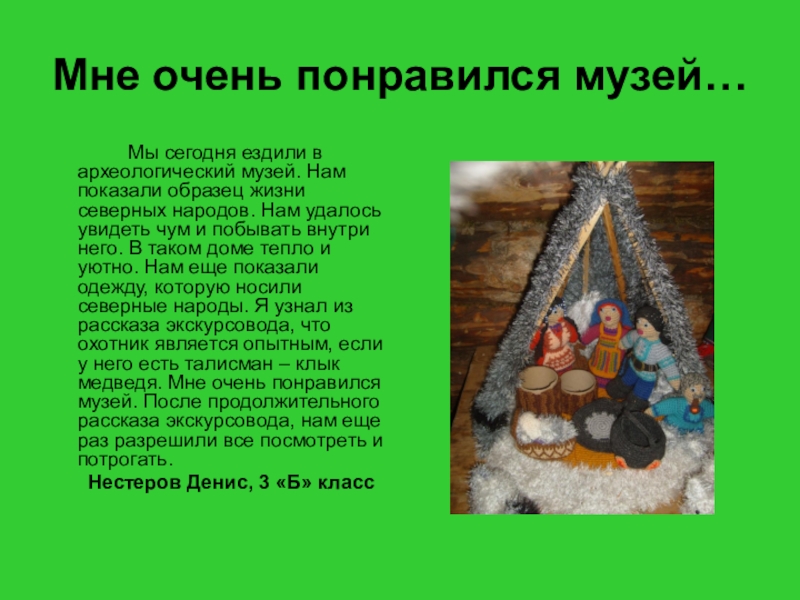 образец жизни северных народов. Нам удалось увидеть чум и побывать внутри него. В таком доме тепло и уютно. Нам еще показали одежду, которую носили северные народы. Я узнал из рассказа экскурсовода, что охотник является опытным, если у него есть талисман – клык медведя. Мне очень понравился музей. После продолжительного рассказа экскурсовода, нам еще раз разрешили все посмотреть и потрогать.