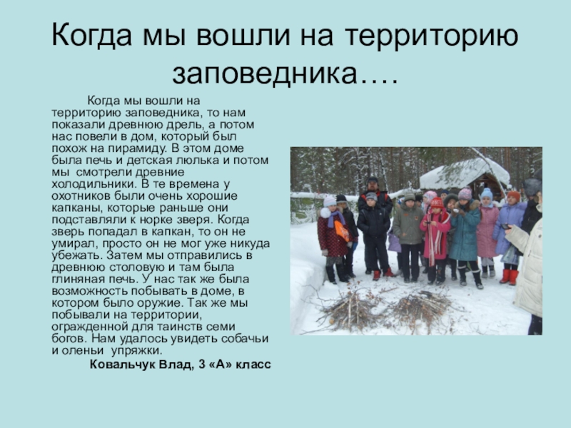 то нам показали древнюю дрель, а потом нас повели в дом, который был похож на пирамиду. В этом доме была печь и детская люлька и потом мы смотрели древние холодильники. В те времена у охотников были очень хорошие капканы, которые раньше они подставляли к норке зверя. Когда зверь попадал в капкан, то он не умирал, просто он не мог уже никуда убежать. Затем мы отправились в древнюю столовую и там была глиняная печь. У нас так же была возможность побывать в доме, в котором было оружие. Так же мы побывали на территории, огражденной для таинств семи богов. Нам удалось увидеть собачьи и оленьи упряжки.